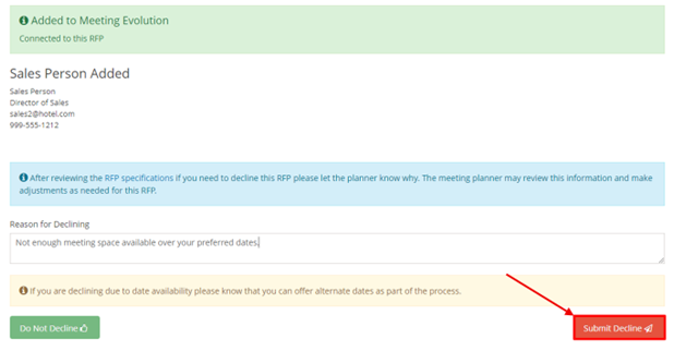 Step 2 - Select Decline RFP and provide the planner with the reason for the turn down. This information will appear in the planner's site reports.