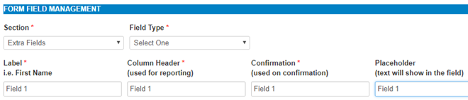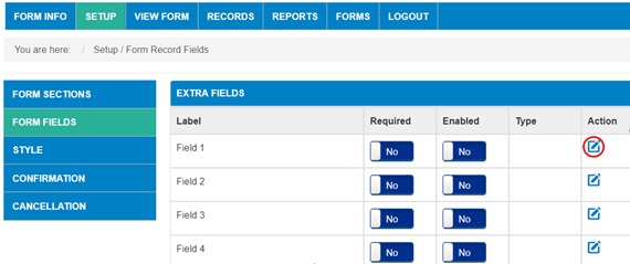 By default, all fields are contained within the EXTRA FIELDS section. Your new sections will not show until a field is assigned to it. The first step is to select the edit icon under the Action column for Field 1 (circled in red). From here you can select the sections you created in the previous step and assign each field to desired sections.