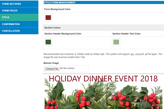 Create the look of the Form page in the Style Tab. Click on each COLOR to select the Background and Section banner colors as well as DOWNLOAD the image that will display at the top of your form. (Please note the recommended size of the image as 1000px wide by 200px high)