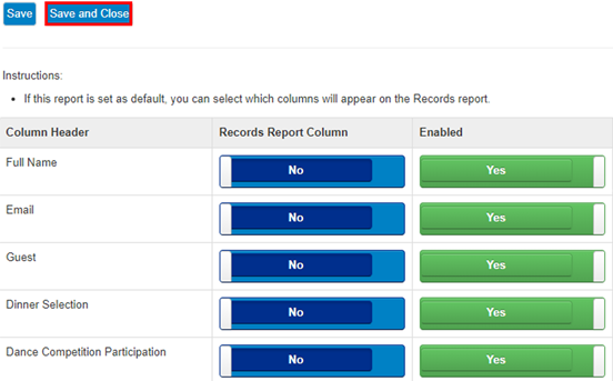 - Default Records Report Columns (below) will be NO and should remain NO because this report will not display in RECORDS tab