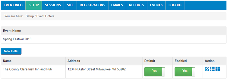 If you have selected the SLEEPING ROOMS checkbox on the EVENT INFO tab, then you have a HOTEL tab showing in SETUP to establish a default hotel and any additional hotels. Registrations will be assigned into these hotels to manage your room block and create Rooming lists.