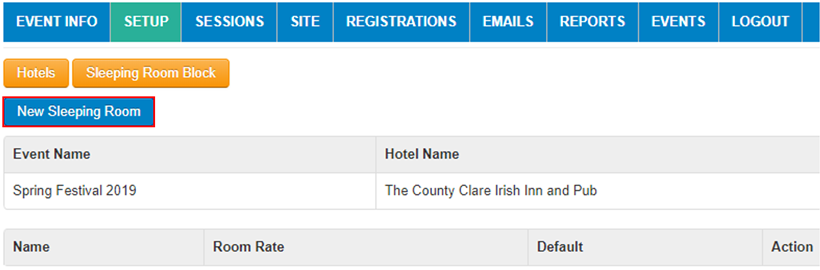 STEP 1 VERIFYING ROOM TYPES HAVE BEEN ADDED - Before beginning the process of adding a default hotel, you need to make sure ROOM TYPES have been added to assign to the hotel. This is back in the TEMPLATE TAB in EVENTS (see below). Here you can add room types by clicking on NEW SLEEPING ROOM, and entering ROOM TYPES based on the hotel contracted room block. These Room Types will be available for every Registration Site in your organization. You may already see the room types you need listed here. If so, you do not need to add these again.