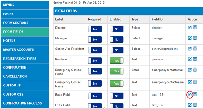 Creating New Fields - By default, all additional fields are contained within the EXTRA FIELDS section. (Be sure the Extra Field section is not set to hidden in order to access these fields) Your new sections will not show until a field is assigned to it. The first step is to select the edit icon under the Action column for Extra Field text_138 (circled in red). You are looking for only these TEXT_# Fields as they have no programming attached to them for reporting purposes.