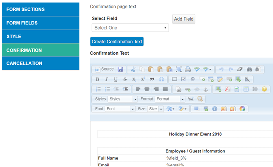 Now that you have set up the hotel and created the form by completing all of the form sections and fields, it is important to create the confirmation text. This step creates the confirmation email that is generated when a registration is submitted.